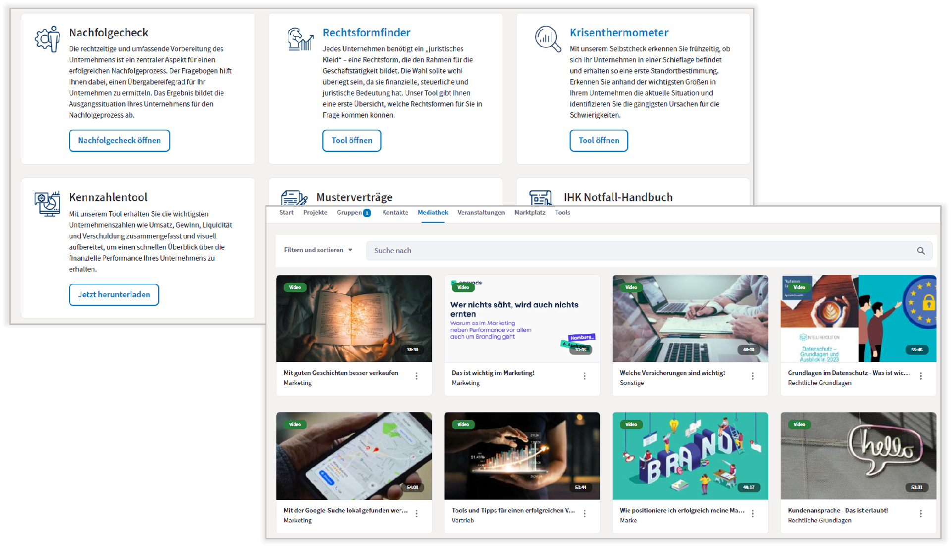 Entdecken Sie die Unternehmenswerkstatt und profitieren Sie von weiteren Tools und Möglichkeiten! Sie können unsere umfangreiche Mediathek nutzen, die Fachwissen aus verschiedenen Branchen bietet. Außerdem finden Sie in der UWD Muster-Kaufverträge und einen Rechtsformfinder. Sie haben auch die Möglichkeit, sich mit anderen Gründer:innen und Unternehmer:innen in unseren Community-Gruppen zu vernetzen.
