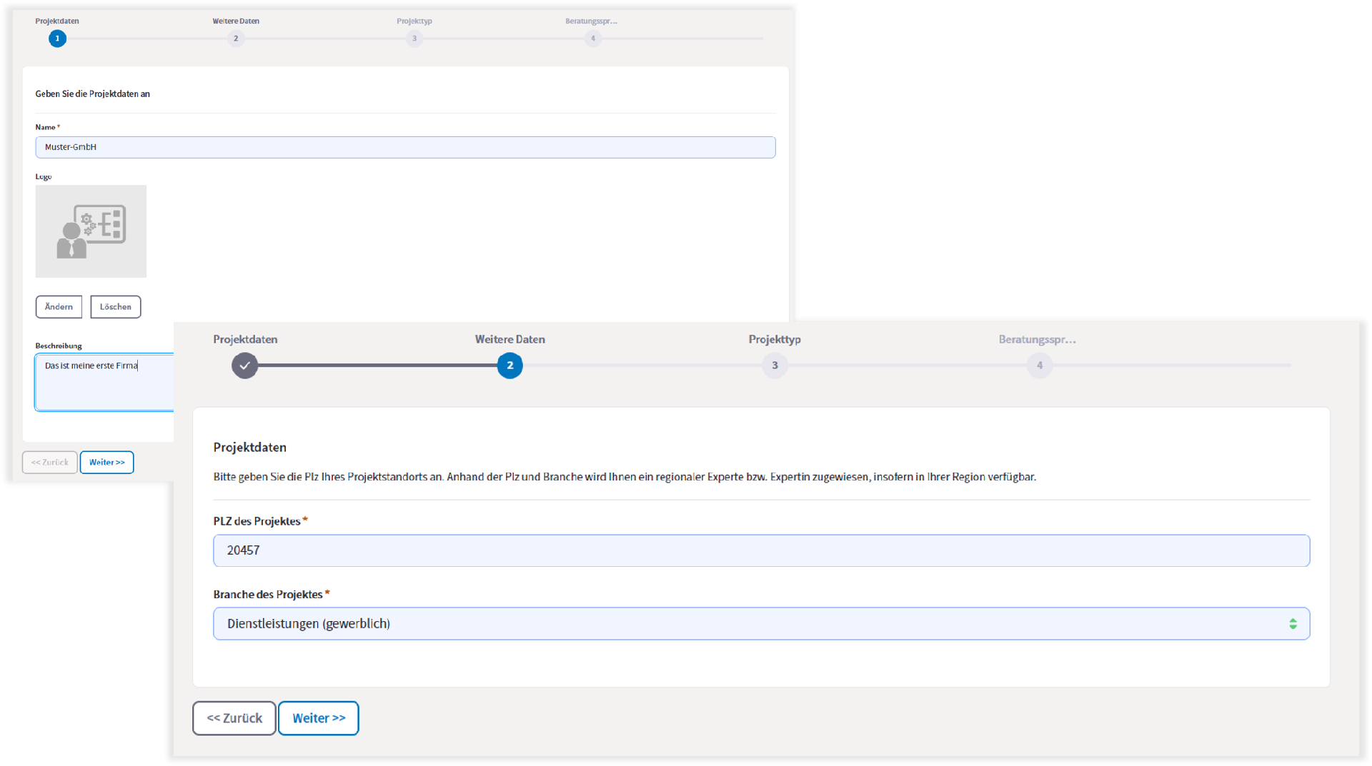 Nachdem Sie sich registriert haben, können Sie ein Projekt erstellen. Gehen Sie dazu auf der Startseite zum Button "Erstes Projekt erstellen" und folgen Sie den Anweisungen. Anhand Ihrer ausgewählten Postleitzahl und Branche wird Ihrem Projekt ein Experte aus Ihrer Region zugeordnet.