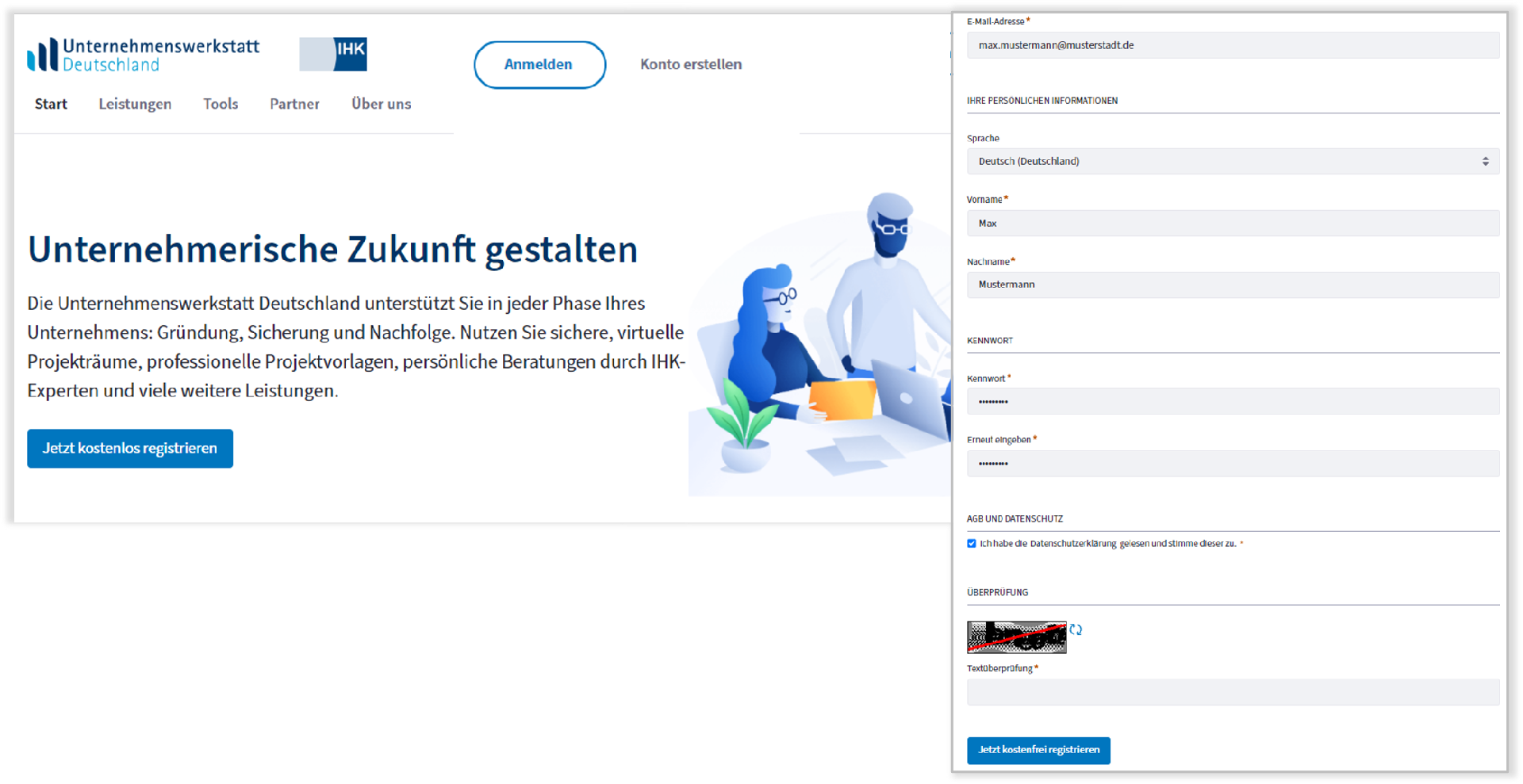 Um die Unternehmenswerkstatt benutzen zu können, müssen Sie sich einmalig und kostenlos registrieren. Dabei benötigen wir von Ihnen: