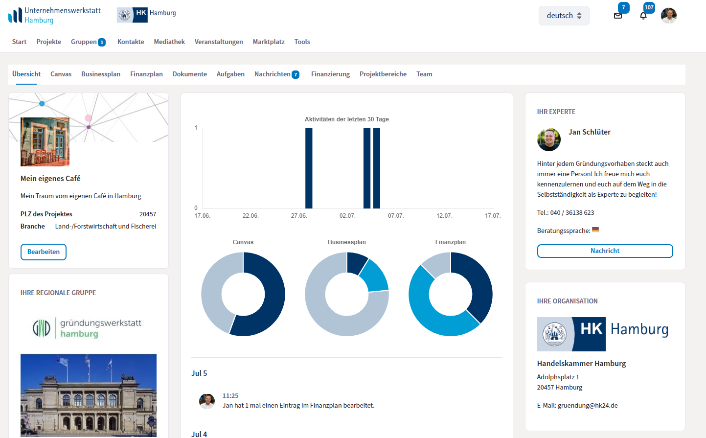 Nachdem Sie Ihr Projekt erfolgreich erstellt haben, können Sie jetzt loslegen. Nutzen Sie den interaktiven Projekt-Fahrplan, um die verschiedenen Projektinhalte zu entdecken. Sie haben auch die Möglichkeit, mit Ihrem Experten in Kontakt zu treten. Dadurch können Sie sich für einen ersten Austausch miteinander verbinden.