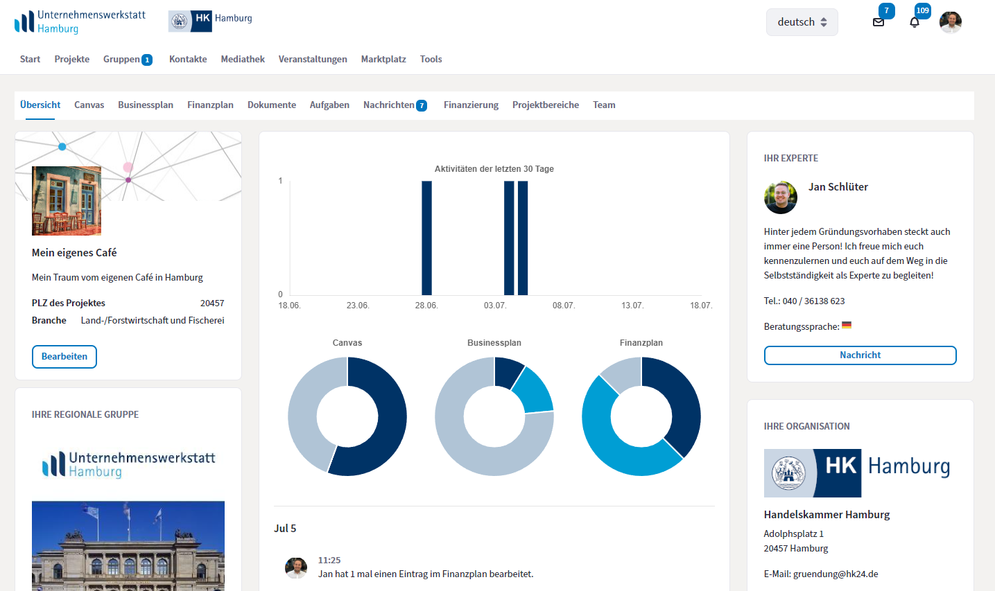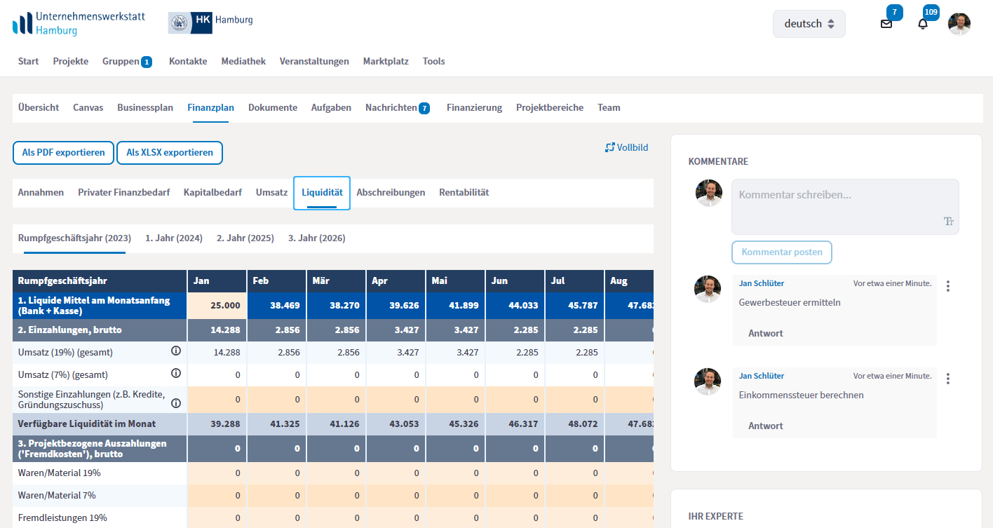 - einem vordefinierten, bankenfähigen Finanzplan mit Liquidität, Rentabilität und einer monatlichen Finanzübersicht über drei Jahre und