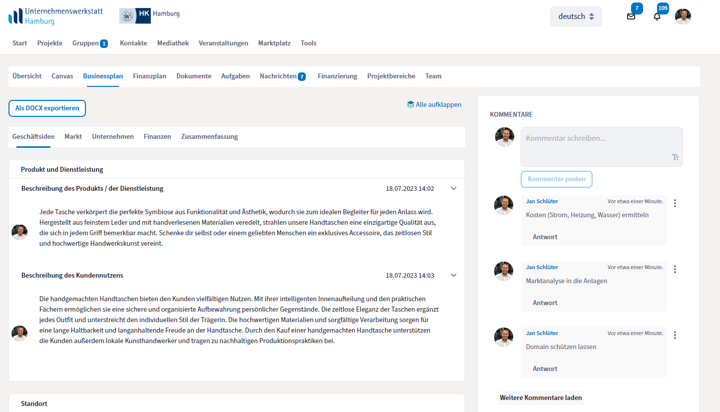 - einem Businessplantool samt Erklärungen, Leitfäden und Beispieltexten,